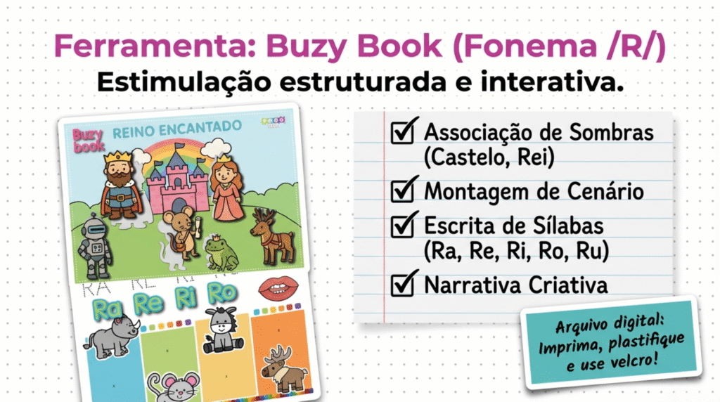 Aprender a pronunciar sons difíceis, como o /R/ (de “barata” ou “carro”), exige prática. Para evitar a repetição monótona, a estratégia atual envolve materiais interativos como o “Buzy Book”.
