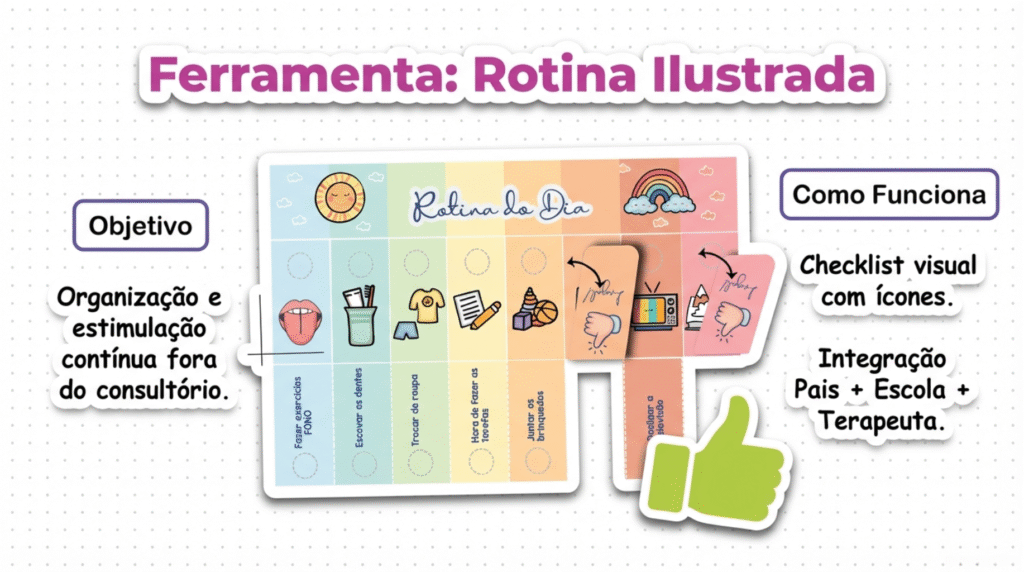 A organização externa auxilia a organização interna (mental). O uso de recursos como a “Rotina Ilustrada” é uma estratégia poderosa para estruturar o dia e estimular a fala.