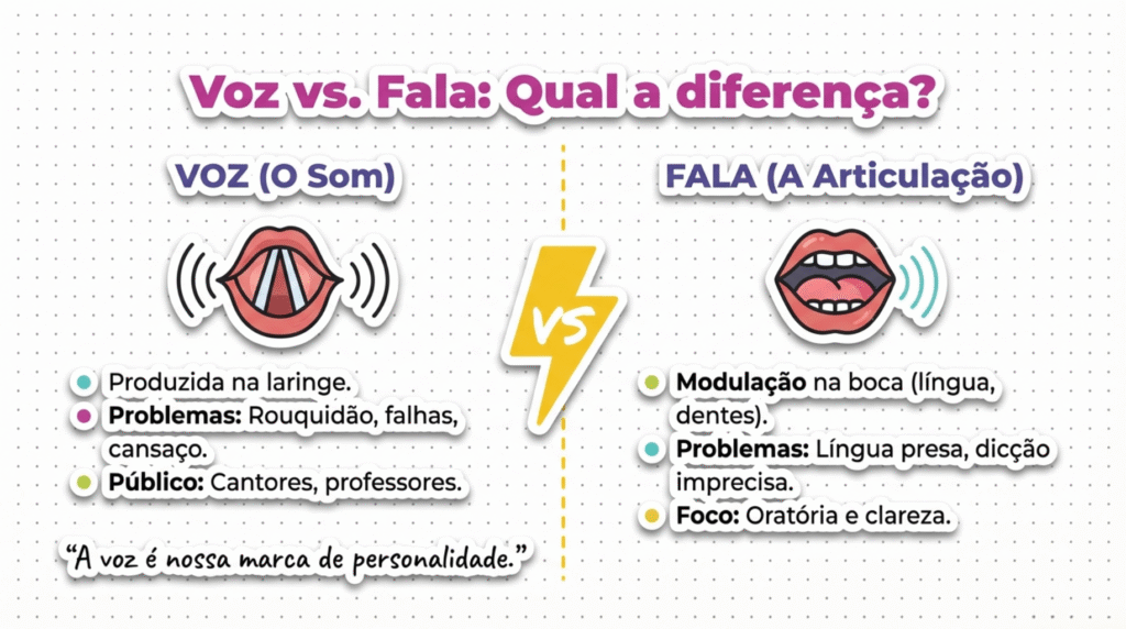 É vital distinguir. Voz é o som (se está rouco ou fraco), Fala é a articulação (se a dicção está clara). Pais e professores devem estar atentos: se a criança ou o adulto fica rouco com frequência ou cansa ao falar, pode haver abuso vocal ou lesão.