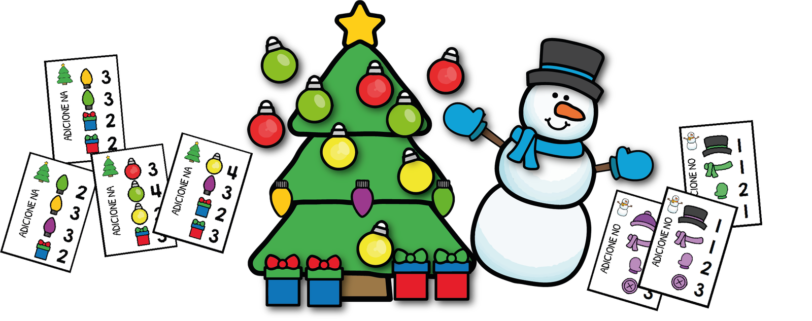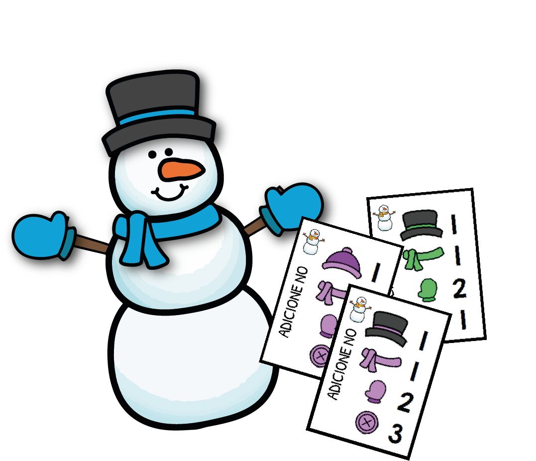 Atividade Boneco de Neve: Inclui o corpo do boneco, itens de vestuário (gorros, luvas, botões) e fichas de comando.
