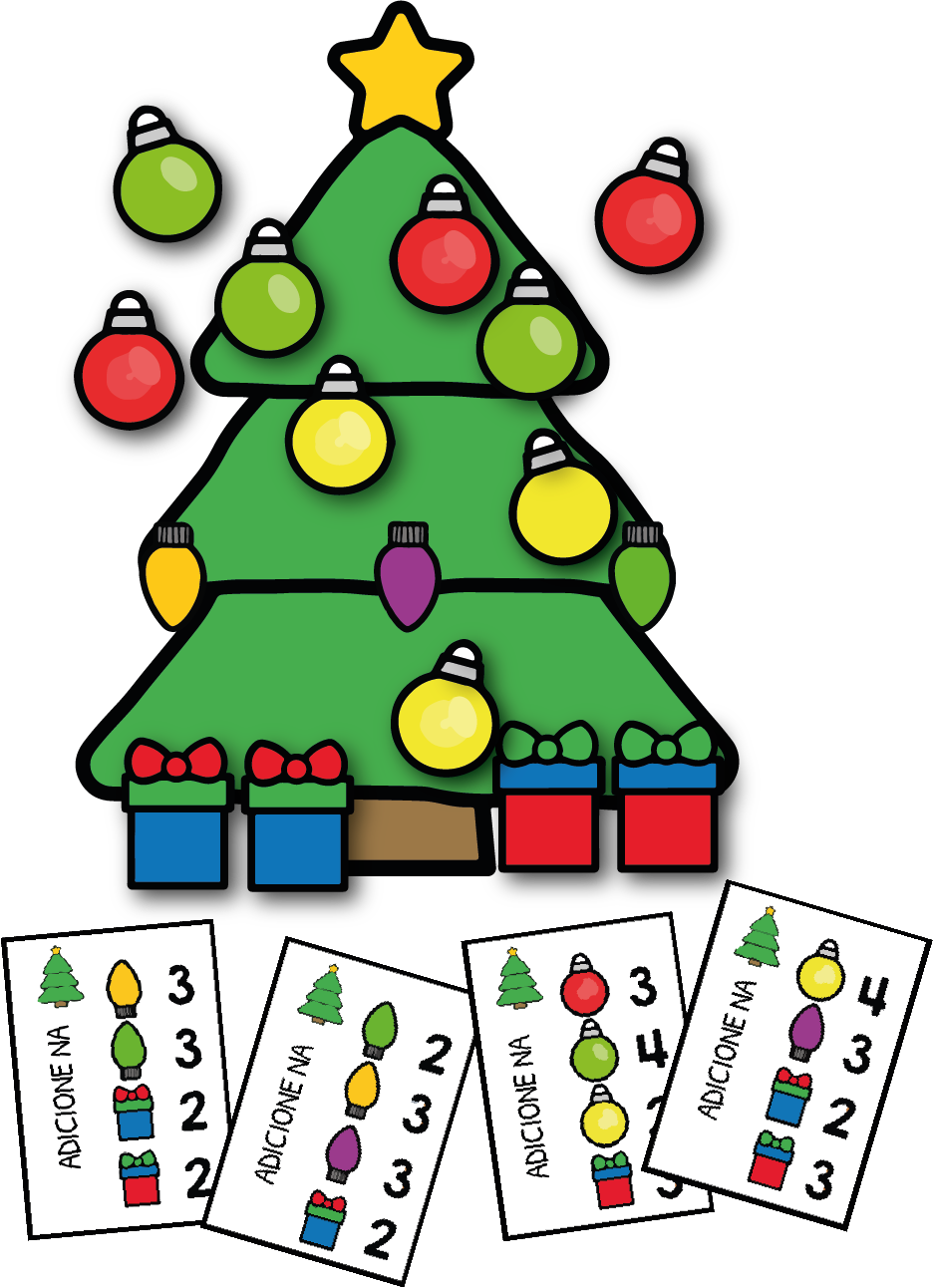 Atividade Árvore de Natal: Inclui a base da árvore, bolas coloridas, pisca-piscas e fichas de solicitação.