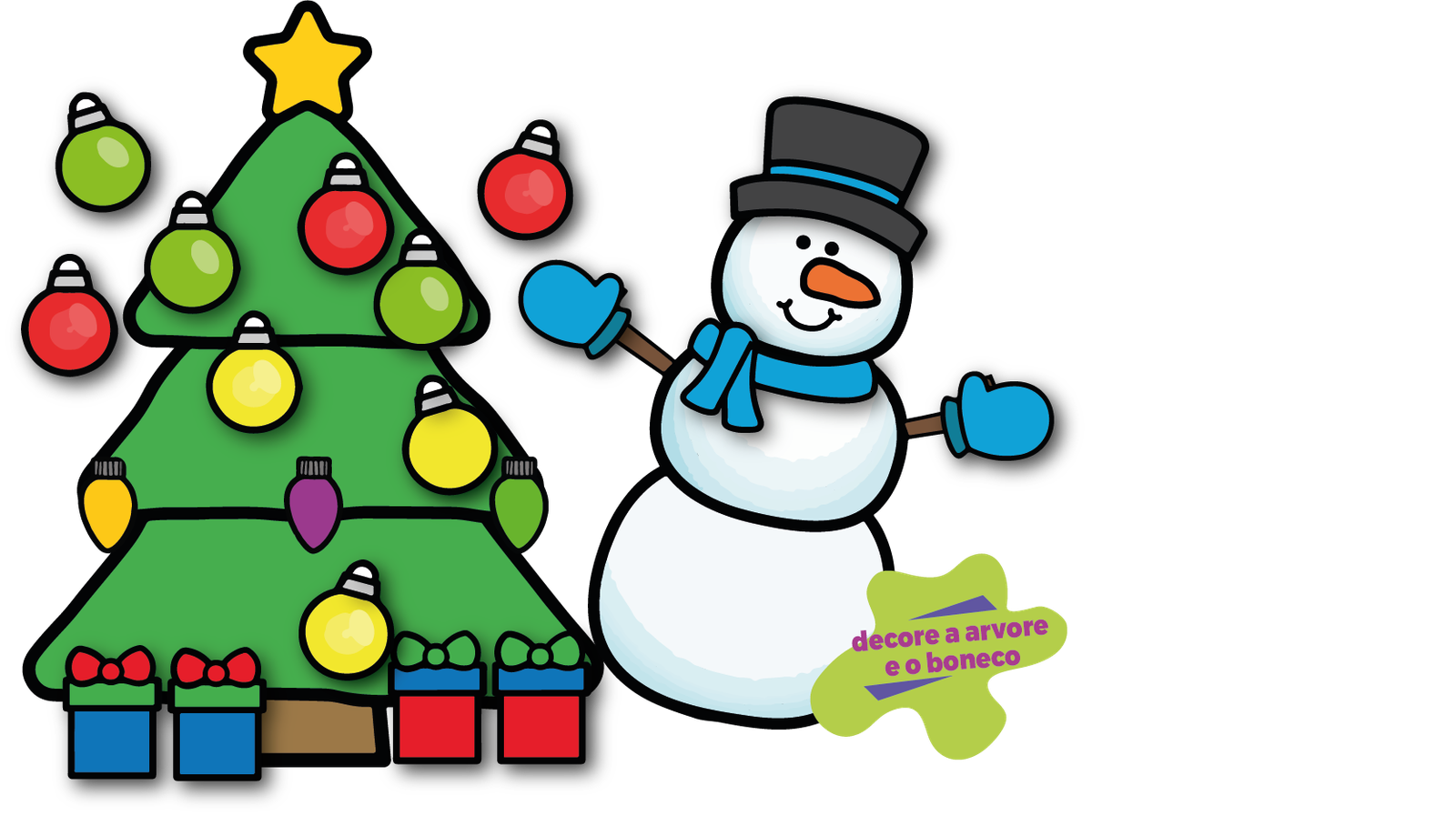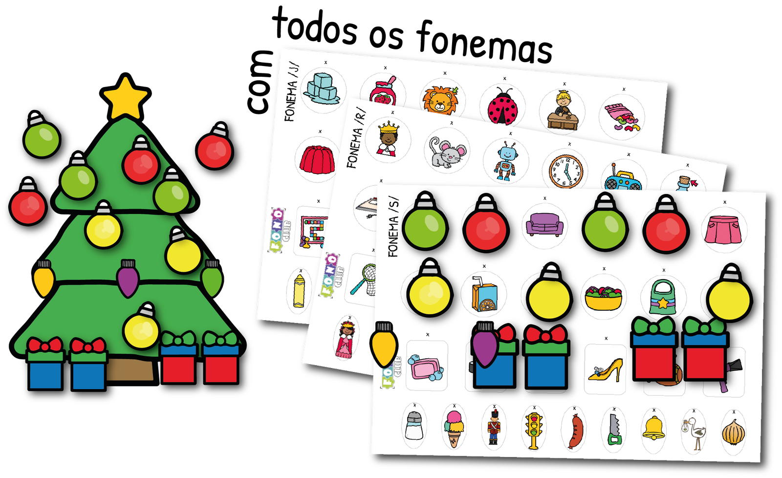 Tanto na árvore quanto no boneco, você pode colocar os itens decorativos (bolas ou botões) sobre figuras de fonemas-alvo. Ao retirar ou colocar o item, a criança deve nomear a figura escondida.