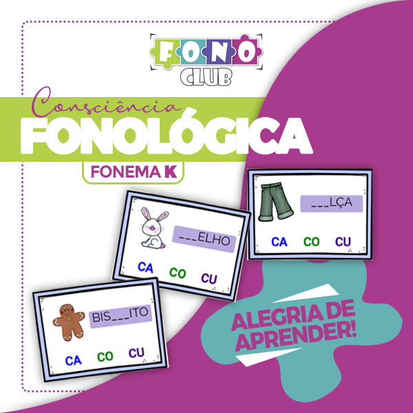 Material de fonoaudiologia destinado a intervenção e treinamento do FONEMA K. Usado também para treinar as Habilidades necessárias de Cosnciência Fonolófica e pronúncia correta das palavras.